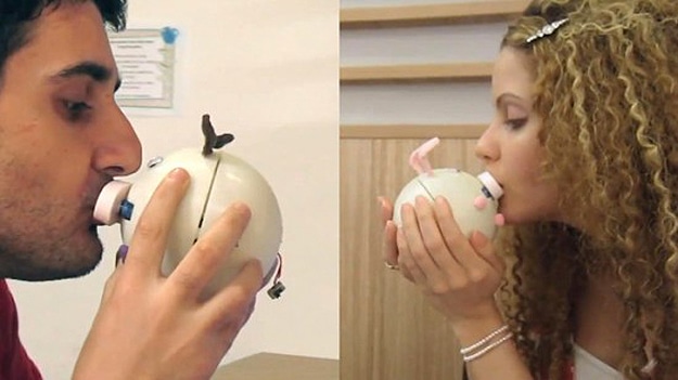 However, that doesn’t stop people from trying to find viable ways to create these experiences. What you see below is the Kissenger, which is a long distance kiss messenger. In order for this to work, both people have to have that little pig looking robot thing. When they want to kiss each other, they simply kiss their pieces of plastic. The Kissenger will then transmit the lip movements from one to the other.
