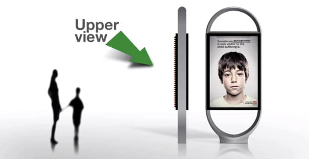 This street sign is designed to help abused children even if they are in the company of their abuser. If an adult looks at this street sign, they will see a generic message about child abuse. If a child looks at this street sign (or anyone under 4’5” tall – which is the average height of a 10-year-old boy), the child will see the bruises on the child’s face, the secret message and phone number to call for help.