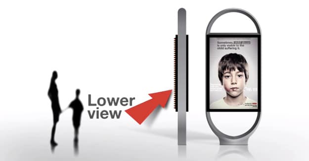 Although this use of lenticular printing is brilliant, I can’t help but wonder if children will be afraid that the adult saw them looking at the sign since the children won’t realize that the adult can’t see what they see, if that makes sense. Also, what about children that are too young to read? Either way, I hope this particular sign helps some abused children in the part of Spain where it is located. I can suddenly think of all kinds of other ways marketers might use lenticular printing technology…