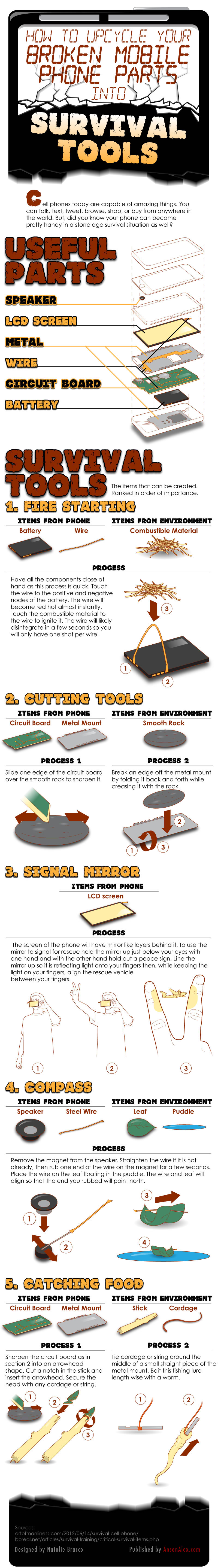 This infographic called How To Upcycle Your Broken Mobile Phone Parts Into Survival Tools is brought to us by Anson Alex (design by Natalie Bracco) and is a good attempt at educating us all on what goodies lie hidden within our power gadgets. These lifehacking smartphone tips are carefully explained and are sure to give you a fighting chance if you find yourself in a situation which requires some advanced survival tools and skills. This will definitely keep you alive long enough until someone either realizes you are gone or comes to your rescue.