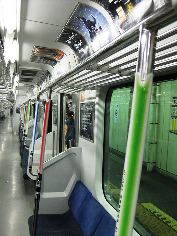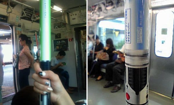 In Tokyo, they have gone one step further and actually incorporated lightsaber handrails in their subway carts. I am not talking about some similar looking, bright light, shining poles which you can hold onto if the cart should rock or stop. I am talking about actual lightsaber poles that have the same glow (no actual lights though) and that look like lightsabers. If it is in connection to the release of the new Blu-ray edition of the Star Wars series I have no clue, but it is quite geektastic if you ask me.