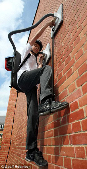 He created a wall climbing apparatus complete with sucker pads out of those vacuums. He mounts his homemade gadget onto himself with a backpack, and up the wall he goes! He has learned how to change the amount of suction to move around the walls as he likes.
