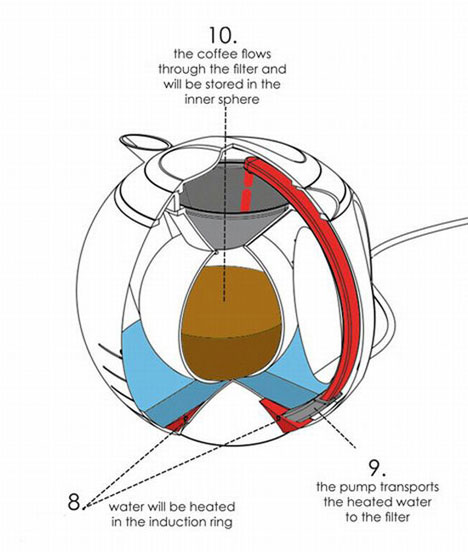 As I was contemplating drinking a semi-cold cup of coffee tonight while I was playing around on the Internet, I found my dream coffee pot. It’s simple and sleek, and it keeps coffee hot for a really long time! It is called the Cocoon – Echo Coffee Machine and it is designed by Jan Koenig. This eco-friendly coffee pot does not heat up hot plate beneath the coffee pot like traditional pots. Instead, it has an insulated hollow pot that traps the heat for a long time. According to https://www.thedesignblog.org, “The Cocoon coffee machine features two spherical bowls. After the water gets heated in the outer sphere via induction, a pump in the handhold brings the heated water to the filter. When the coffee is ready, it enters the inner sphere. Now, the hollow space created between the two spheres acts as insulator to keep your coffee warm for a longer time.”