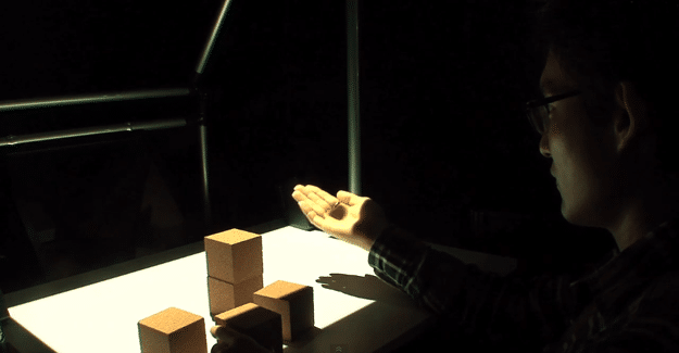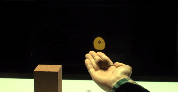 In their demo video, they showcase a fully immersive hologram that you can interact with. So far the projected hologram is only 2D, but the interaction seems to be working flawlessly. The aim was to create a hologram that intelligently always wanted to stand on the highest point in the holographic viewing field. The height is adjusted by wooden blocks, but the hologram is so intelligent that you can even use your hands to bounce and interact with it in realtime.