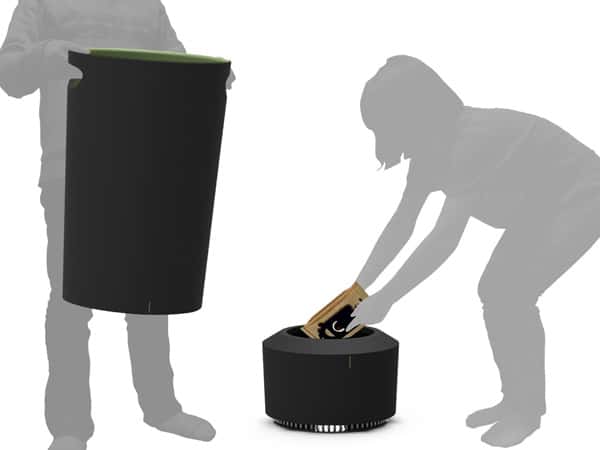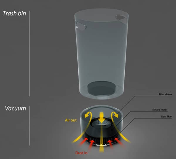 I know that when I am in the middle of a website design, I always get a ton of paper trash from my wireframe designs, feature lists and so forth. I have a trash bin of course, but putting it in there is just a temporary solution because I eventually have to take care of it when the trash bin is full. The Cuum is set out to change at least a little bit of our trash problems. The Cuum is a regular trash bin mounted on a base that is a vacuum. Simply sweep the dust on the floor towards the base of the trash bin, and it will suck it all up and store it until you throw it away or recycle it. Yeah I know, it doesn’t really solve our problems when it comes to taking the trash out, but there are other ways to take care of that.