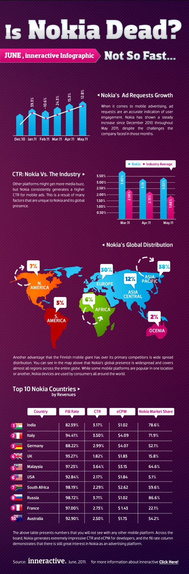 In addition, Nokia is well known for its manufacturing skills and while many people have had complaints about the Symbian operating system, no one denies the solid and impressive build of the average Nokia device. Combine that stellar hardware with the fresh and intuitive Windows Phone 7, then throw in Nokia’s global dominance, and you have yourself a recipe for a successful mobile ecosystem. Of course, some might disagree and many have declared the company dead, but the infographic below, which addresses both Nokia’s achievements in the mobile advertising world as well as its global distribution and overall market share, seems to imply otherwise. Infographic credit: @inneractive