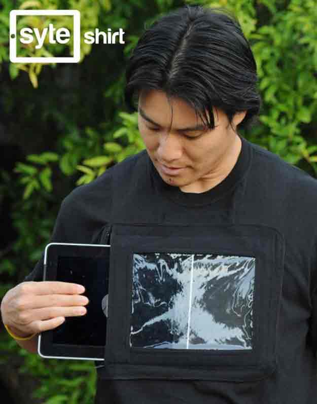 What if you could store your iPad right in your clothes? That’s right, now you can carry your iPad around neatly and securely in a clear little pouch sewn into your shirt!