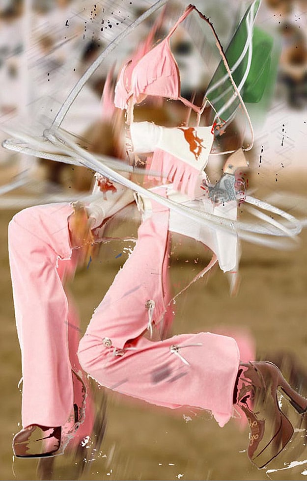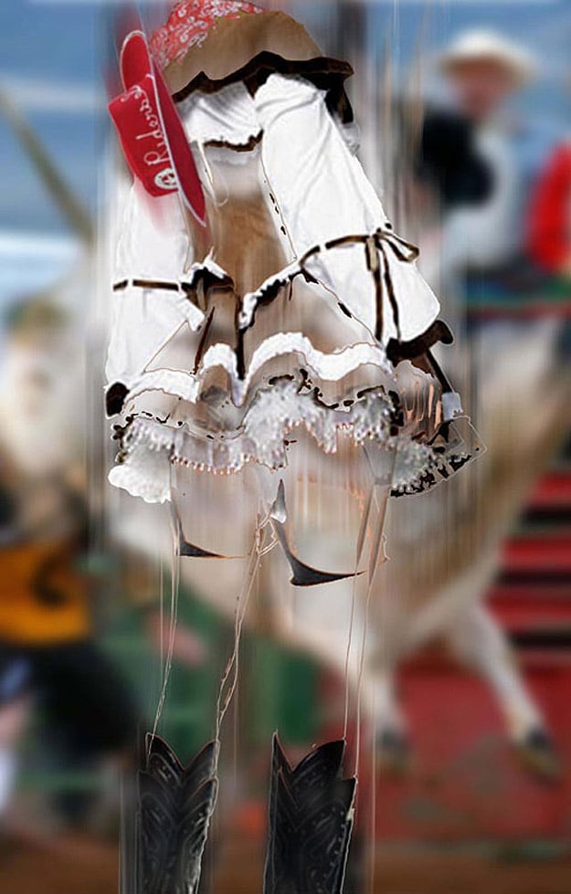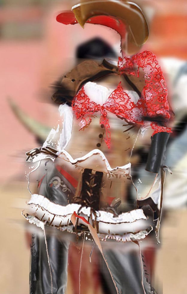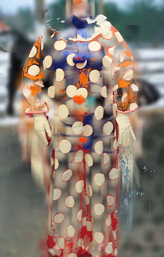Deborah says, “I do not want to just repaint an illustration of what the computer can do, but to push the pixels themselves as paint, and to layer imagery and veils to create depth and volume.” These images are part of a collection called the “Wild Wild West Show,” which combines old-fashioned cowgirl pictures enhanced with new digital technology. Aside from the fact that clowns in general freak me out, I really like these! Nice!