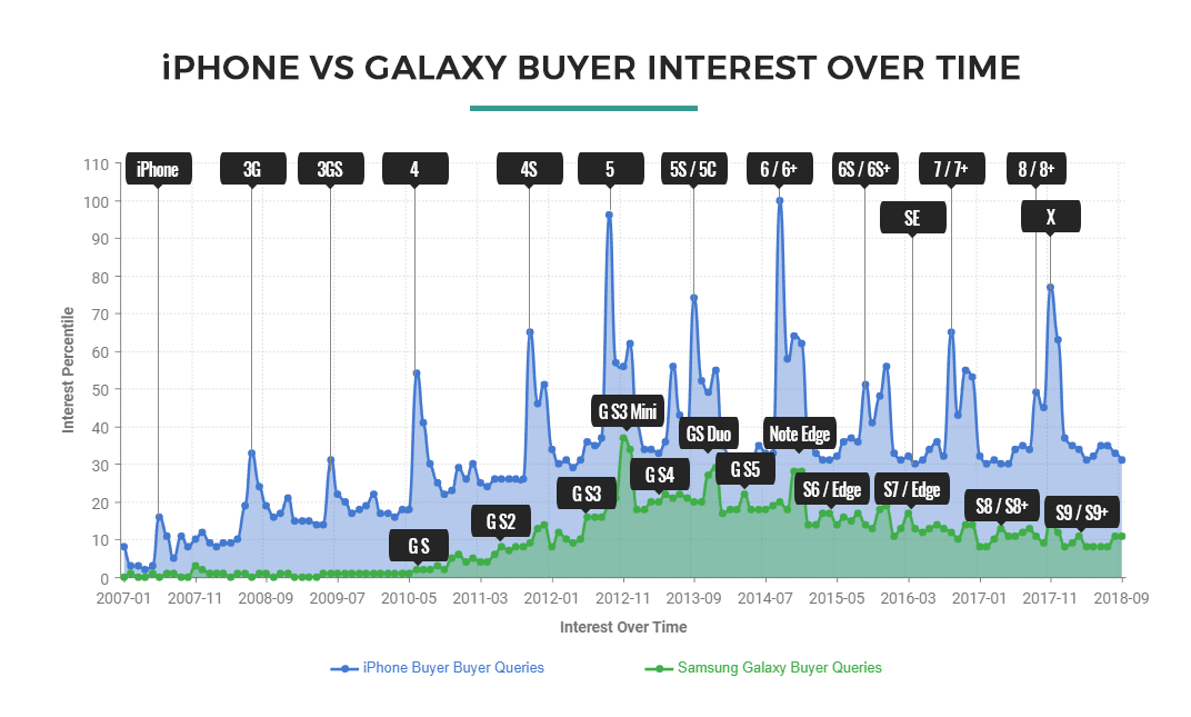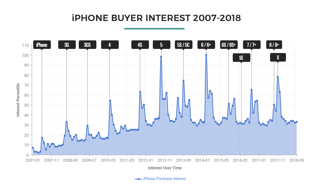 • Following the iPhone 6 launch, the explosiveness of these releases and the peak of general interest queries began to decline with the SE, 7 and 8.