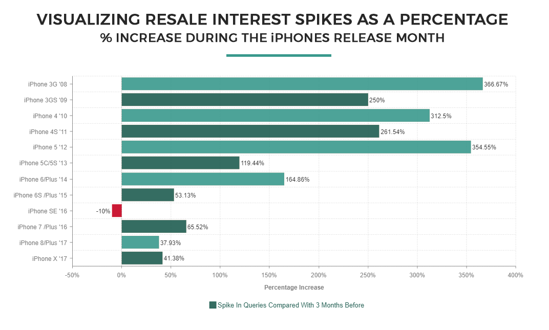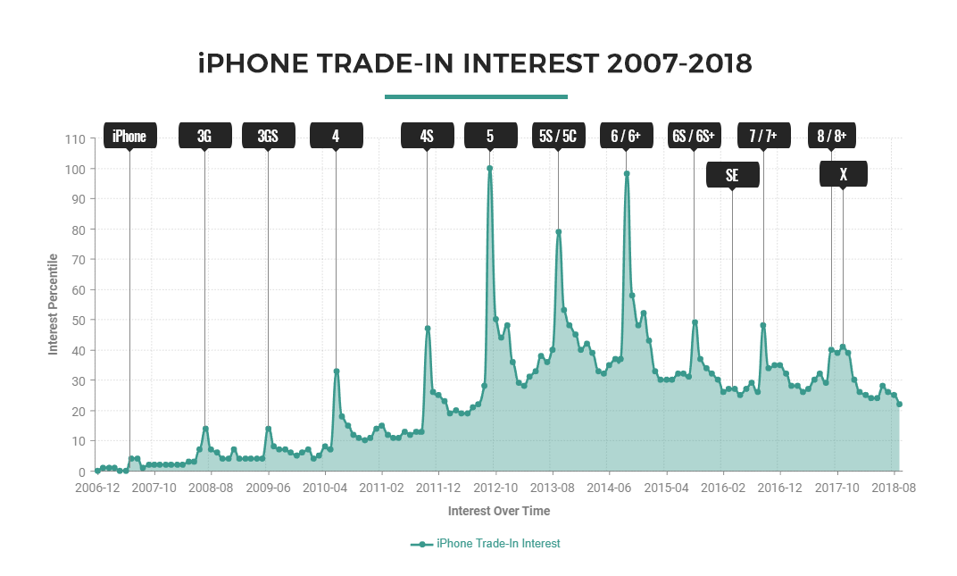 The next set of data sent to us is focused on resale related queries. The cell phone trade-in site aimed to show how the iPhone releases impact consumer enthusiasm, getting them to value their old devices and potentially trade in or sell through online marketplaces.