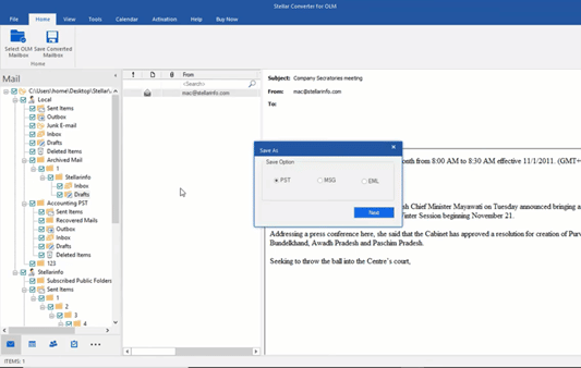 I reviewed the contents of the OLM file and selected the folders I wanted to save to a PST file. Then I clicked the Save Converted Mailbox button on the top, under the Home tab. The program then offered three options i.e. three file formats to save the converted file. These were PST, MSG, and EML.