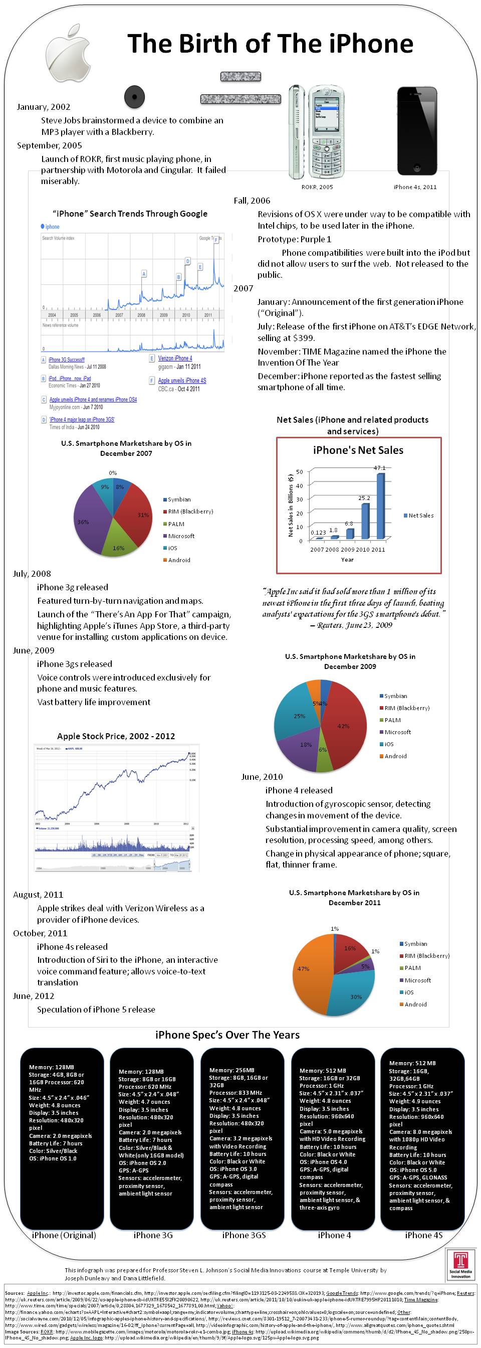 I guess that was why Temple Fox MIS published an infographic called The Birth Of The iPhone that is entirely dedicated to the iPhone birth and evolution. It’s a timeline so to speak. It differs a little from the usual infographics that we see about the iPhone. It has a more in depth approach and lines up the previous incarnations to compare stats and further demonstrate the never ending evolution it goes through. It is as much of a timeline for Apple’s success as it is an evolutionary timeline for the actual iPhone itself. The question is whether or not we’ll see the iPhone 5 this year, or if Apple is secretly working on a greater update that will take a little bit longer to complete now that most people are expecting a new design and some new ground breaking features. Maybe this time around, we’ll finally see a projector incorporated. That would be a serious game changer for the iPhone. To be able to project movies on walls at home with just an iPhone would not only boost its usefulness but also the user’s urge to purchase a heck of a lot more movies from iTunes. We’ll just have to cross our fingers that this is not too far away.