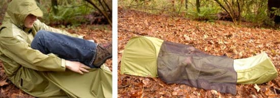It is called the Jakpak. According to Fast Company – It’s loaded with features, suited for three seasons of camping (spring, summer and fall). The jacket itself is breathable and waterproof. It even has a routing system for iPod cords. Inside, extra fabric in the lining can be unfurled to create a sleeping bag. There’s also another large flap, integrated into the back, that converts the sleeping bag into a one-person tent. The jacket interior even contains a mosquito net.