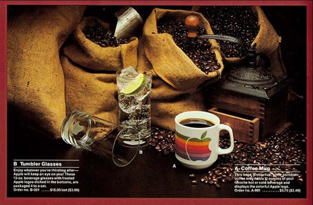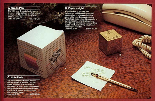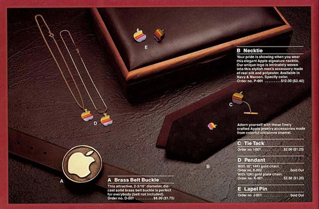 One thing that Steve Jobs was quick to start working on when he returned to Apple in the ’90s was branding and image. Currently, the Apple Company Store sells mugs and t-shirts (and other things like that), but you can only get them by visiting the actual company store in San Francisco. However, waaaaay back in the old days, believe it or not, Apple had mail order gift catalogs where you could just call up and place an order for Apple merchandise. These are some pictures from the official Apple 1983 gift catalog. That brass belt buckle is super sweet! I wish I could order that right now.