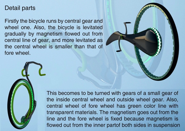 The three designers (Hoyoung Lee, Youngwoo Park, and Jungmin Park) behind this ultimate spaced out bike have really struck a nerve and I think Willy Wonka would be their first customer to buy it. The design really reminds me of the movie “Willy Wonka and the Chocolate Factory” for some reason. Maybe it’s because of the Tim Burton shapes it sports or just the candy grass color it is graced with. Either way, Willy Wonka would be a happy camper traveling around on this one between his different candy factory departments.