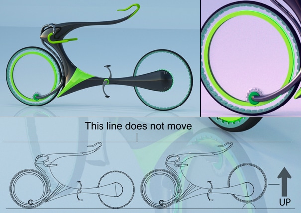 What’s neat with the bike is that the “seat” (if you could call it that) will never move even if you travel over speed bumps or other bumpy obstacles. The seat will stay aligned no matter what happens. It’s the frame that will adjust to the wheels instead of the wheels adjusting to the bumps with shocks. It is kinetic energy that makes this possible. As the biker picks up speed the bike will “lift” off the ground and create a truly smooth and comfortable ride.