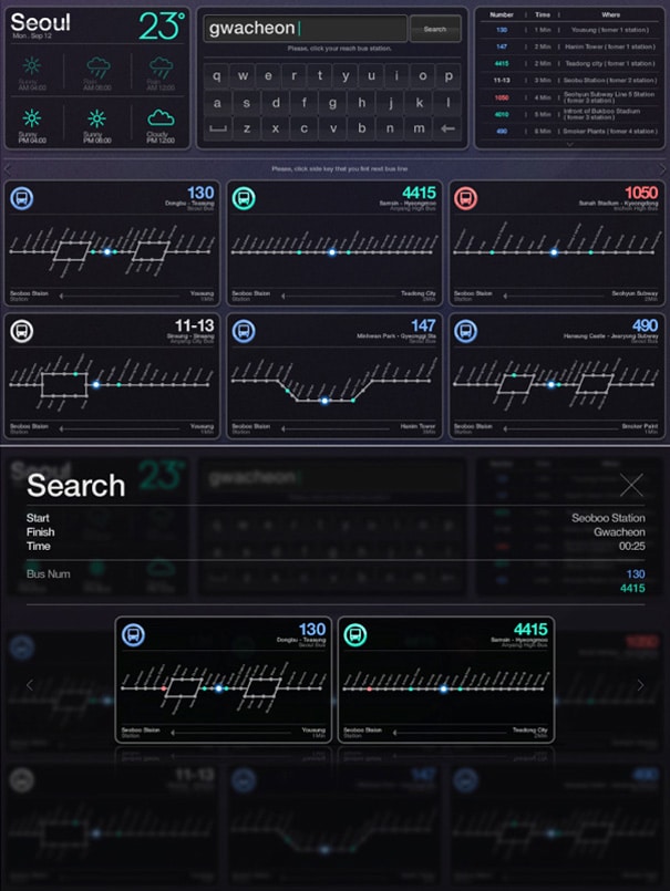 However, there is one thing cooler than this and Soonkyu Jean is the creator and inventor of it. I recently watched Bladerunner, and this bus stop gadget made me think about that movie and beyond. On it, you will be able to tell where the bus is in real time. You’ll also be able to book your tickets and look up time tables.