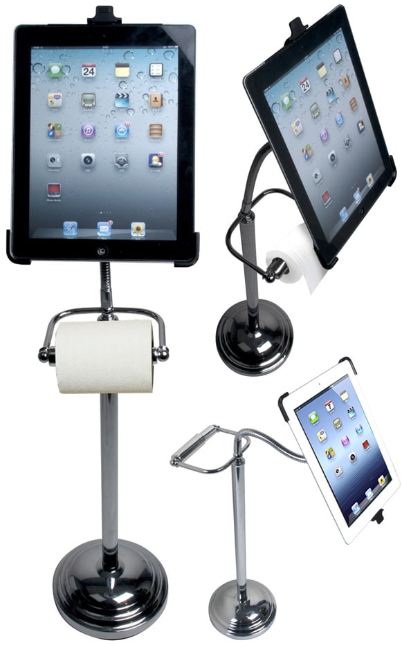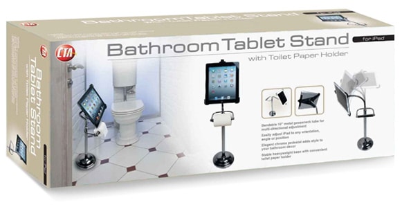 This is definitely a toilet paper holder for techies. People love to use their gadgets in the bathroom. Several different research projects over the past year have come to the same result, which is that the loo is a good place to tweet, update your Facebook status or just check email. I’ve written about it many times, and the fact that 19% of people have dropped their smartphones in the toilet even further supports our bathroom habits.