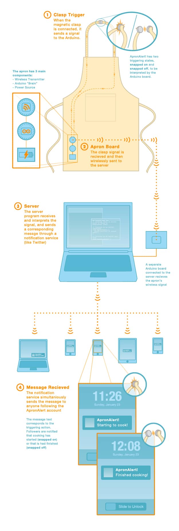 This apron is coded to know when you start cooking and when you are finished cooking based on when you put it on and off (this is through the magnetic fastener on the back of the apron itself). When you put it on, it will send a text or tweet to those in the office and alert them that you’ve started making lunch. When you take your apron off, it will send them another text or tweet that says you are finished making lunch. When they get the second text or tweet, they will know to wrap things up at their desks and head to the kitchen.
