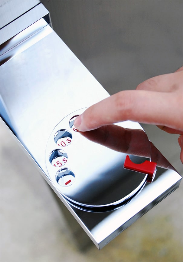 For example, if you just want to rinse your hands there is no need to turn on the faucet and have it flowing for 20-30 seconds while you are getting that soap out of the soap dispenser. No, you simply pull the dialer to “5s” and you’ll get water worth of 5 seconds, which is plenty to rinse off that soap you just rubbed into your hands.