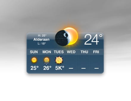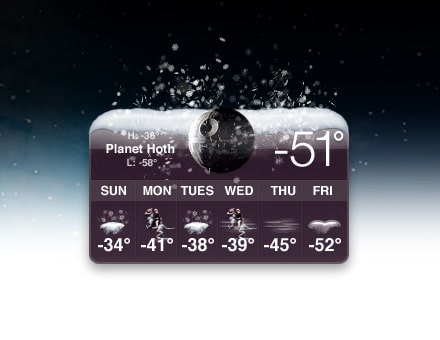 So with that in mind I would like to dedicate this article to Katie. She should totally geek her desktop out with these awesome Star Wars Weather Widgets designed by Cristian Kit Paul. They show the weather, even though they are not functioning widgets, on planets like Tatooine, Hoth, Cloud City, Alderaan and Dagobah.