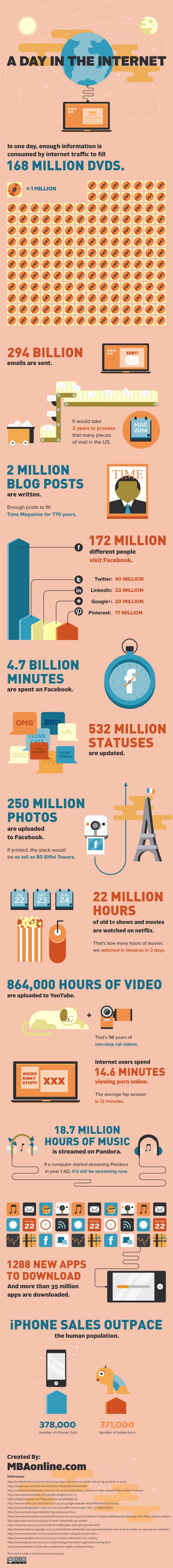 These days, everybody can reach everybody online. If someone doesn’t have some sort of social media profile or an email address, it’s almost as if they don’t exist, as strange as that sounds. MBA Online recently put together this infographic called A Day In The Internet. It highlights in a very detailed and specific way what happens on the Internet in a typical day. Can you believe that on any given day, there are enough blog posts written to fill a Time Magazine for 770 years? And, there are more iPhones sold on a single day than human babies born. Yeah, this is nuts. Enjoy!