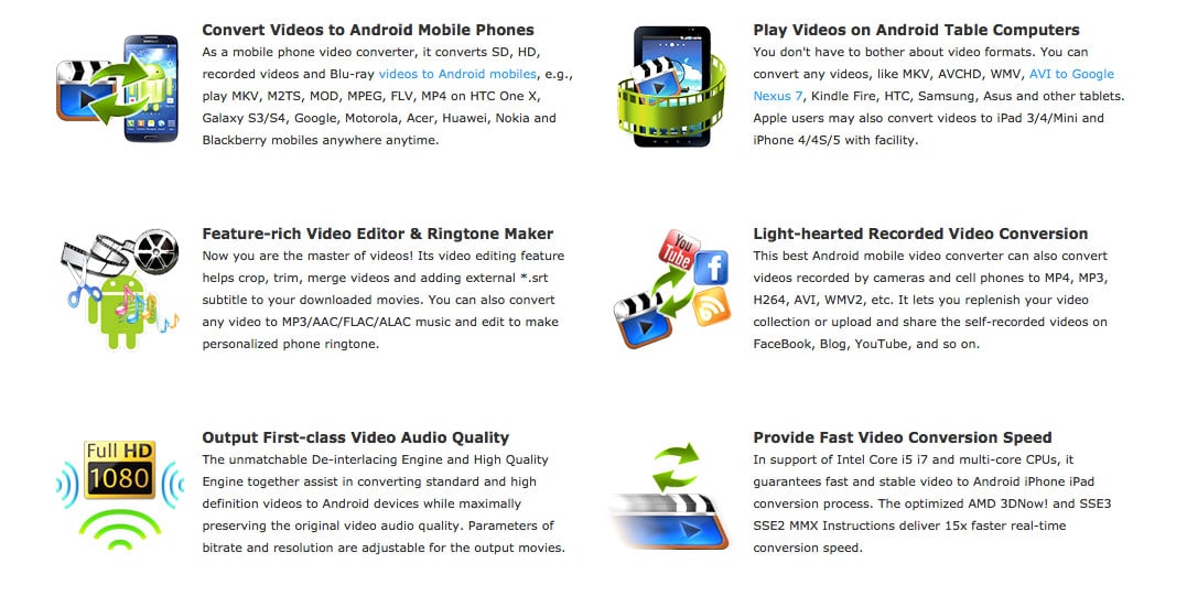 This brand new Android video converter will convert MKV, AVI, MP4, WMV, MOV, FLV, AVCHD, M2TS videos to any popular Android mobile device. These devices include the new HTC One, Android Samsung Galaxy S4, Galaxy Note, Amazon Kindle Fire, Google Nexus 7 and more. It can handle all Android devices, regardless of resolution or screen size.