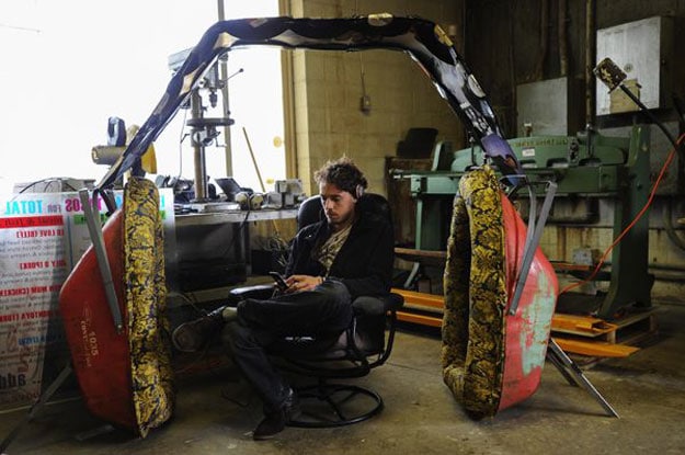 These are the largest headphones in the world, and they were created by Dallyn Rule for the recent Maker Faire in Vancouver. He made these headphones with 100% recycled materials, and they are completely functional. They almost look like two speakers with a little headphone cushion covering them, but it turns out, they are much more sophisticated than that.