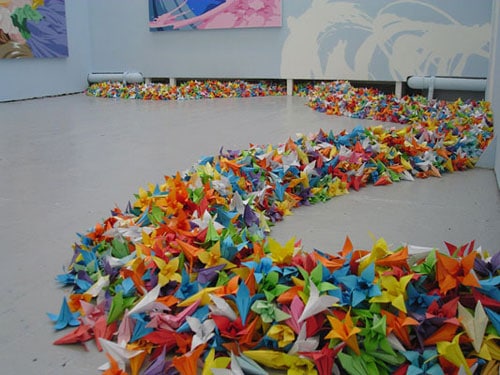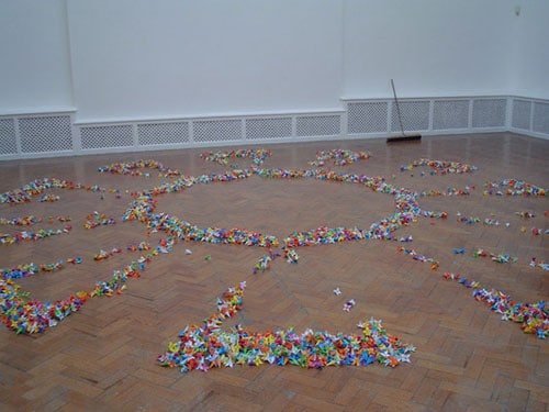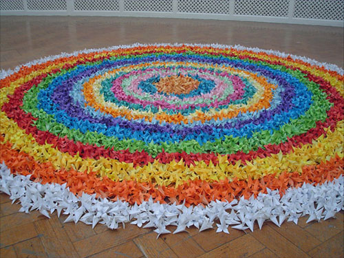 James Roper loves to fold origami flowers. He loves it so much that he folded ten each day for three years straight. Ok you math wizards, how many origami flowers did he end up with? That’s right! 10,000! He named this project “Devotion.” James has a reputation as an artist for being devoted to his work, and this is obviously another illustration of that. The installation below also shows another form of devotion. The circular target illustrates devotion in the form of a mandala and the sun is devotion in the form of a mandala swept away. I can’t help but wonder how fast he could fold these flowers after so much practice. I would love to watch him; he is pro for sure.